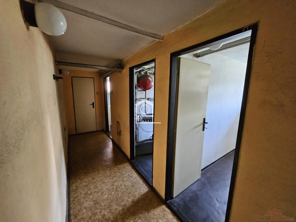 Přízemí: kuchyně, samostatná koupelna, WC, tři obytné místnosti, vstup do sklepa a schodiště do patra, zádveří