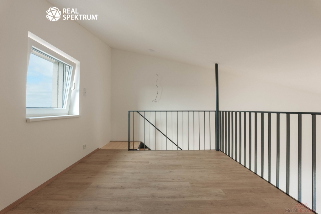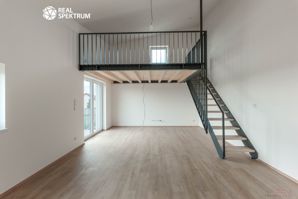 Součástí dispozice je galerie o velikosti 10,3 m2, umístěná nad částí obytného prostoru. Lze ji využít jako ložnici, pracovnu nebo zónu pro odpočinek. Díky tomu byt působí velkoryseji než běžné 1+kk a nabízí praktické oddělení denní a noční části bez ztráty prostoru v hlavní místnosti. Okno v obytné části zajišťuje přirozené osvětlení jak spodní části bytu, tak galerie.