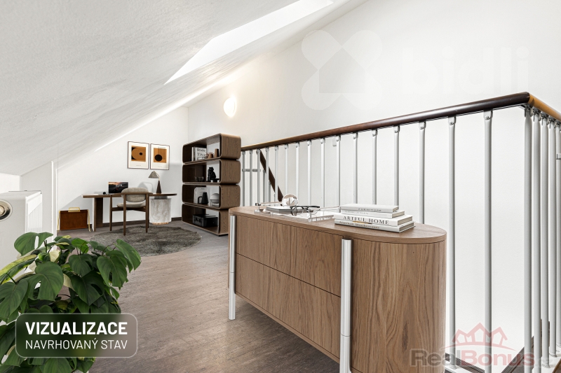 Srdcem bytu je ale velkorysý obývák s kuchyňským koutem. Prostor, kde se vaří, žije, směje, hostí. A nad tím všechno přichází "to navíc": galerie se dvěma střešními okny. Ideální na pracovnu, relax zónu, knihovnu nebo prostě místo, kam si večer zalezete s vínem a vypnete.