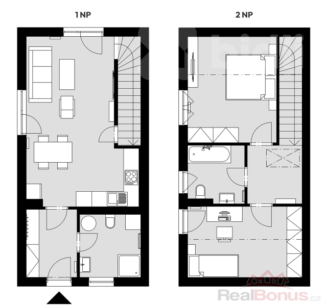 Byt je součástí trojdomu - tedy domu se třemi samostatnými jednotkami. Svým uspořádáním připomíná spíše řadový rodinný dům, ideální pro moderní a úsporné bydlení. V přízemí se nachází prostorný obývací pokoj s kuchyňským koutem, koupelna a zádveří. V patře pak najdete ložnici, další pokoj, druhou koupelnu a chodbu. K bytu náleží také snadno udržovatelná zahrada o rozloze 186 m2, která nabízí prostor pro relaxaci i volnočasové aktivity. Ke každé bytové jednotce náleží 1 parkovací stání.