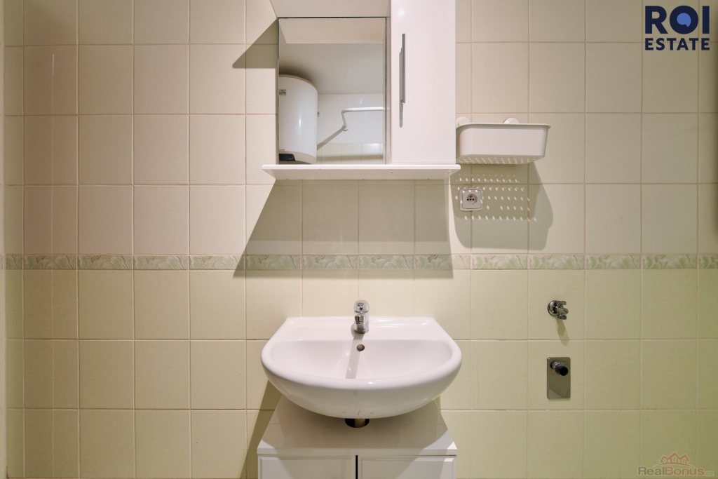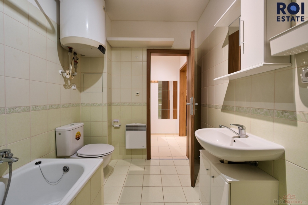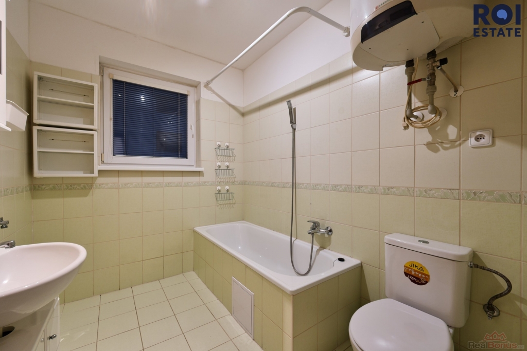 Koupelna je překvapivě prostorná, s oknem, které dodává místnosti vzdušnost. Je zde vana, toaleta, umyvadlo, elektrický bojler a příprava na pračku ? vše prakticky na jednom místě. Vstupní chodba působí příjemně hned po příchodu domů, díky botníku a velkému zrcadlu.