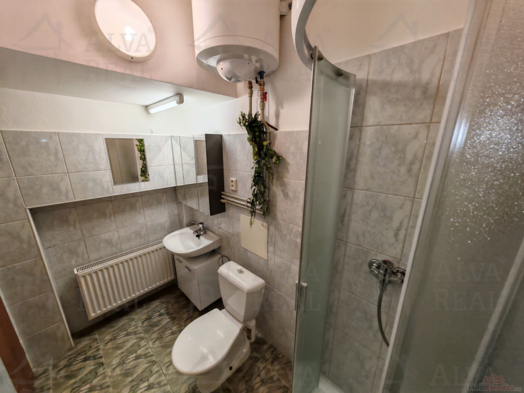Dispozice: hlavní místnost 7x5 m?, prostorná koupelna s novým sprchovým koutem, WC a umyvadlem se zrcadlovou skřínkou o výměře cca 4 m?, chodba cca 6 m?. Hlavní místnost vybavena kuchyňskou linkou s el. sporákem, digestoří a osvětlením. Vytápění bytu centrálním plynovým kotlem + radiátory, ohřev teplé vody zajištěn novým bojlerem v koupelně.