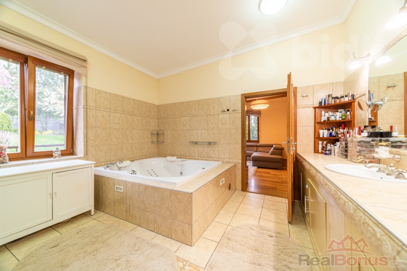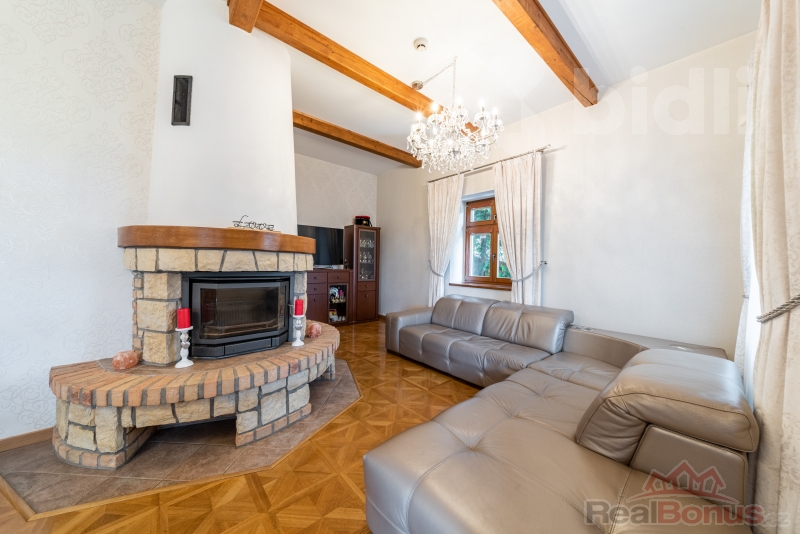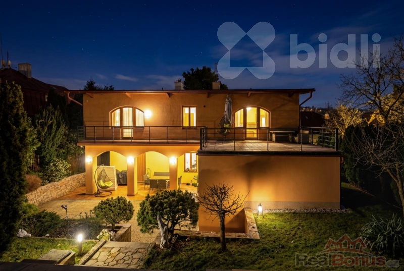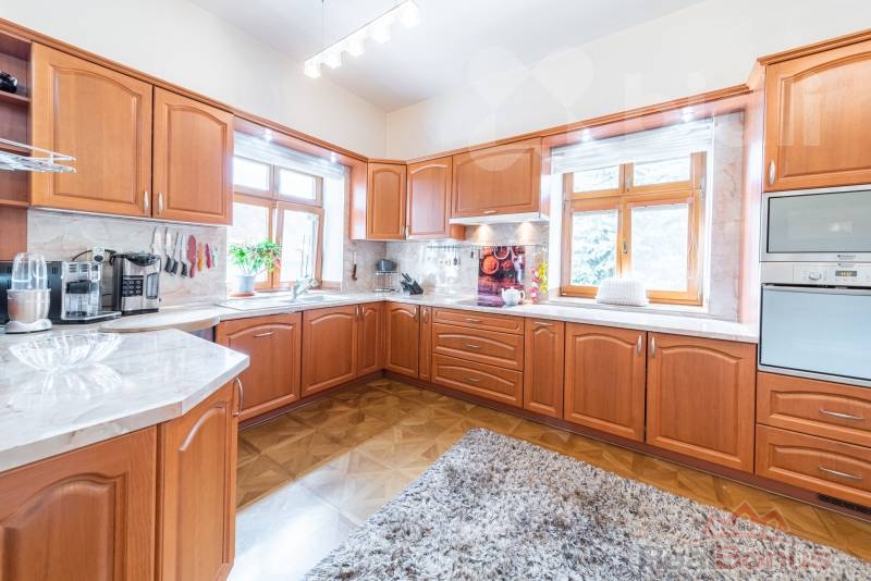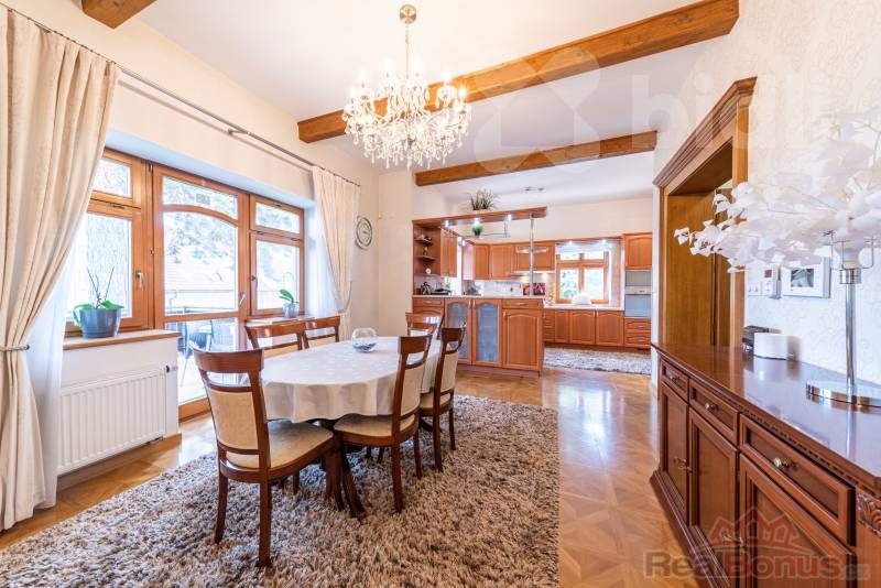 Tato reprezentativní vila stojí na slunném pozemku orientovaném na jihovýchod a nabízí vynikající prostorové uspořádání pro rodinný život i společenské události. V přízemí domu se nachází prostorný světle prosvětlený obývací pokoj s krbem, který plynule navazuje na kuchyň s kvalitní dřevěnou linkou a jídelním prostorem. Velkorysý vstupní prostor vytváří pocit otevřenosti a elegance.