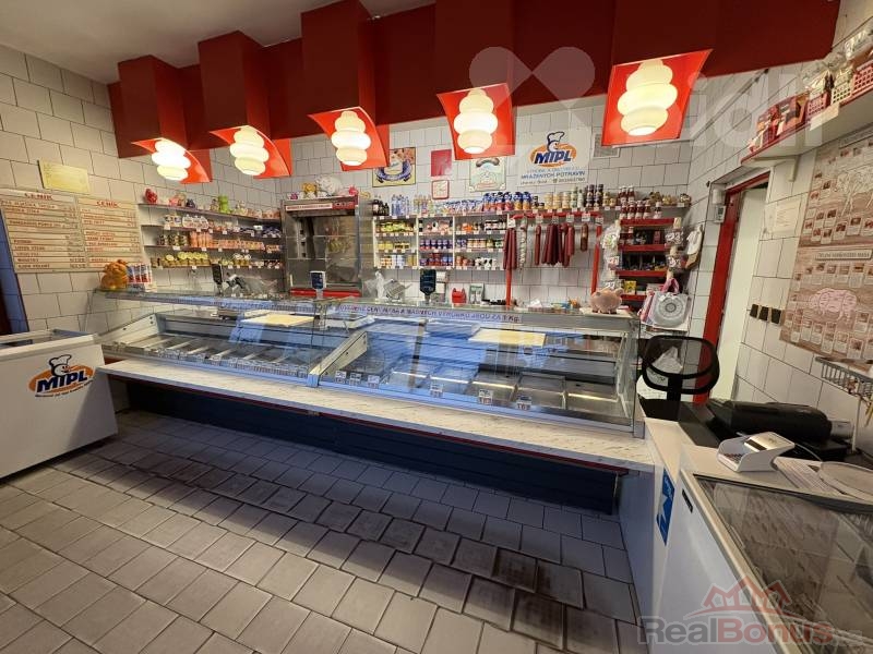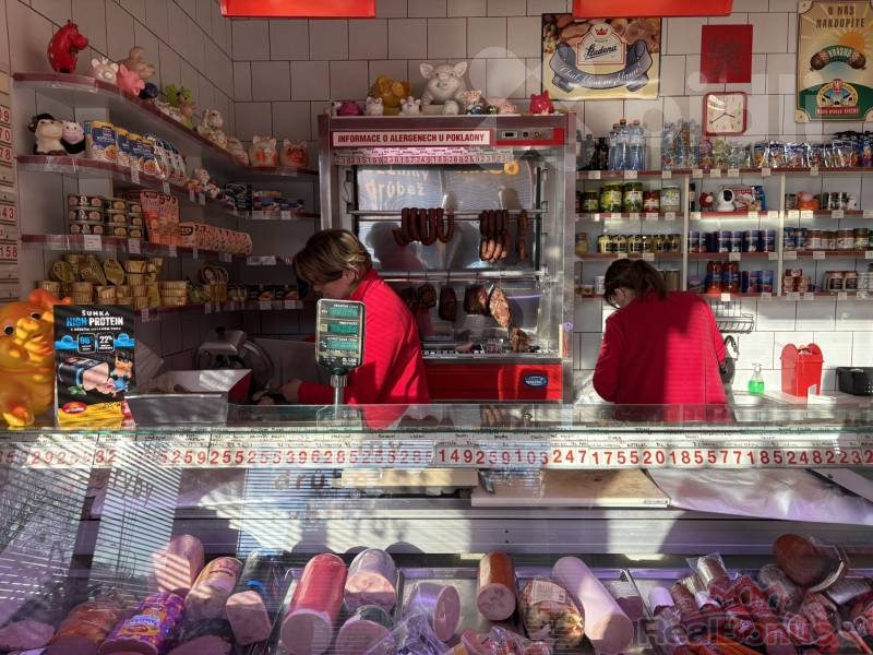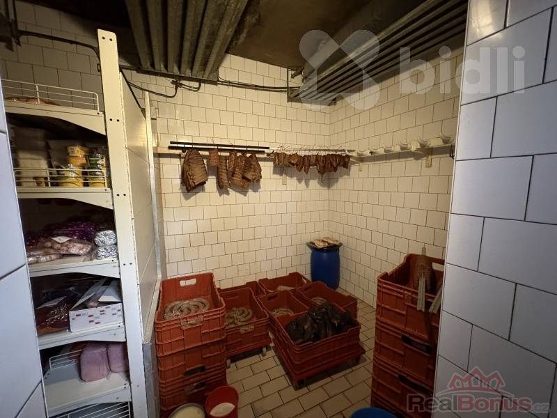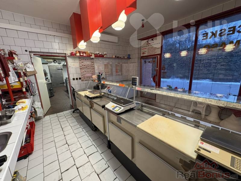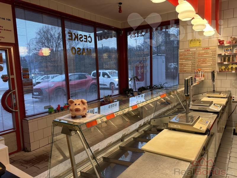 1) Prodejnu (24 m2) - prostor s velkými okny se žaluziemi, zařízený na pultový prodej masa a masných výrobků - chladící vitríny, chladící pulty, pokladna, váhy, nářezové stroje, přímý kontakt se zákazníky