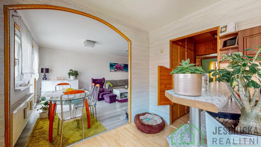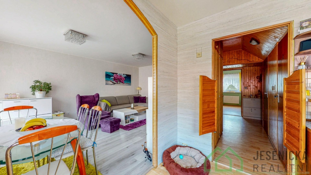 Při příchodu do bytu vstupujeme do chodby, po pravé straně se nachází pokoj , může sloužit jako dětský. Chodbou projdeme do slunné kuchyně. Na chodbě máme vchody do koupelny a samostatné WC. Vstup z kuchyně do obývacího pokoje je zajištěn velkým průchodem, který tyhle dvě místnosti spojuje. Celá jednotka je průchozí. Ložnice je vedená v chalupářském stylu, dominantu tvoří pěkné přiznané trámy.
