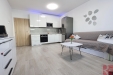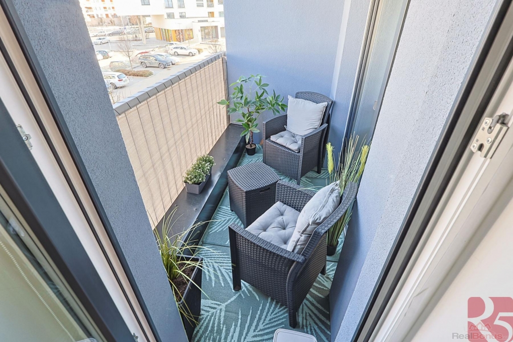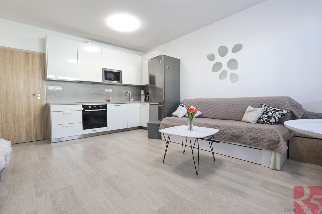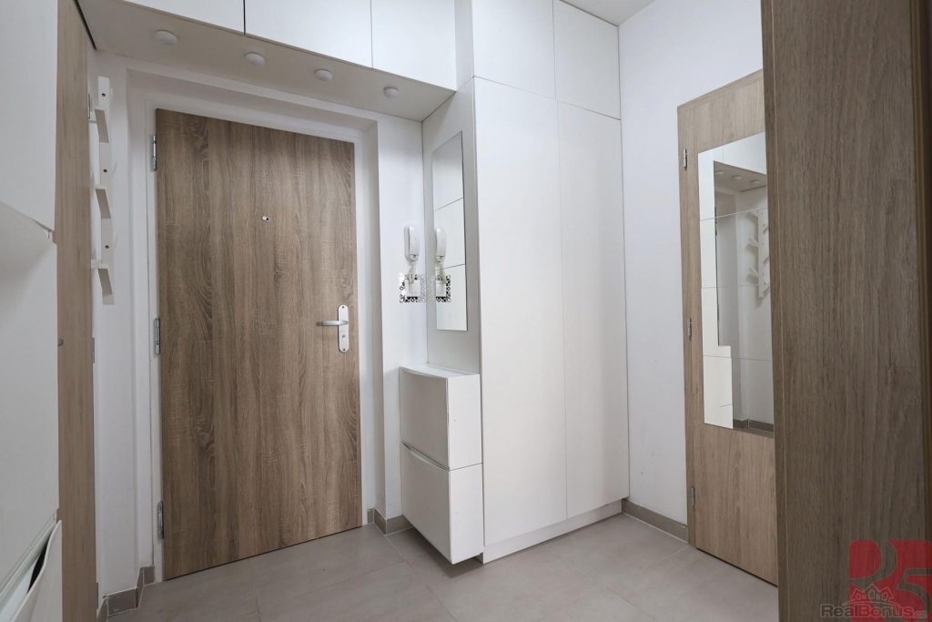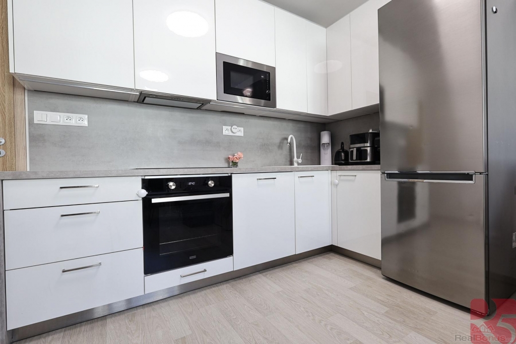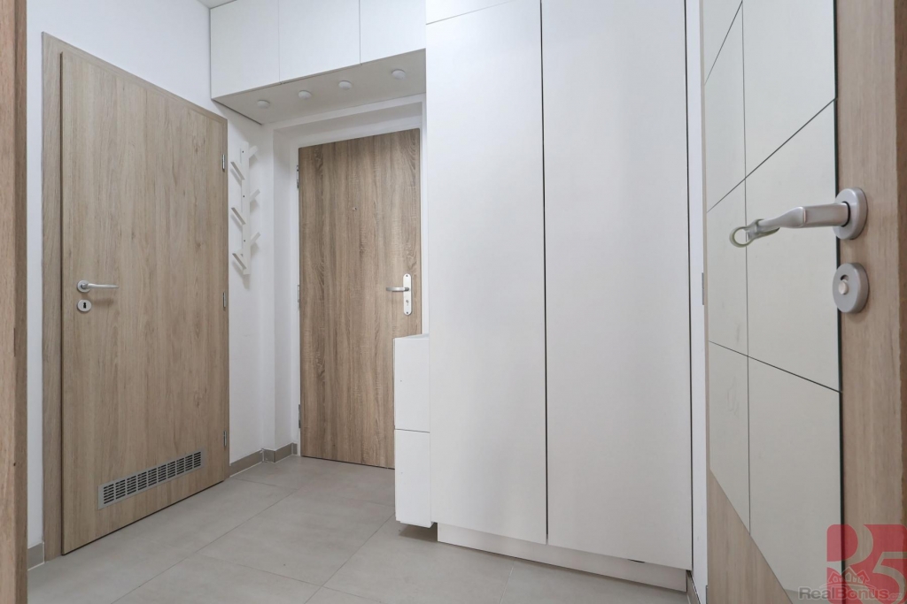 Moderní byt z roku 2021 je vybaven prostornou kuchyňskou linkou se spotřebiči, šatní skříní v chodbě a ložnici. Další úložné prostory nabízí zavěšené skříňky.