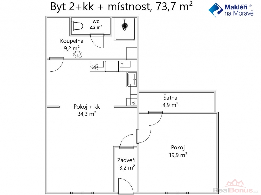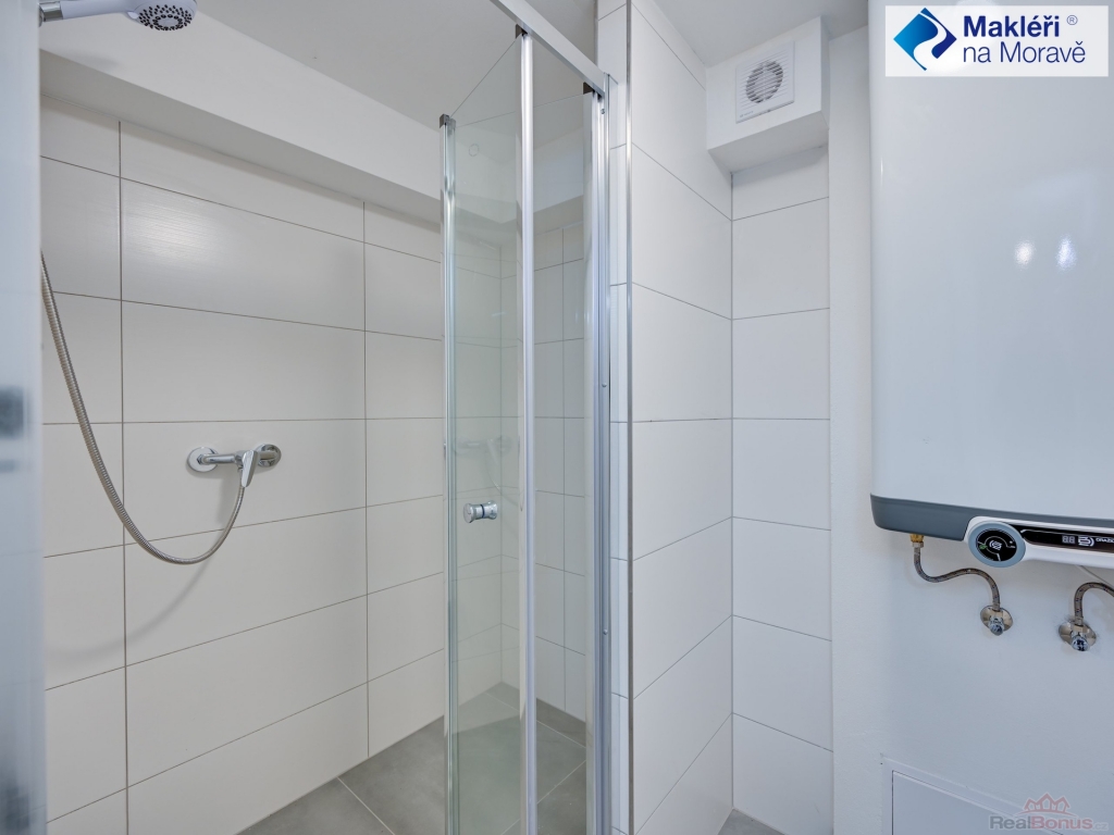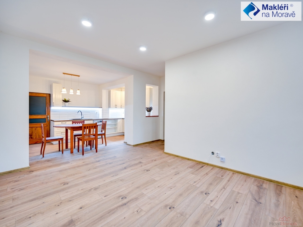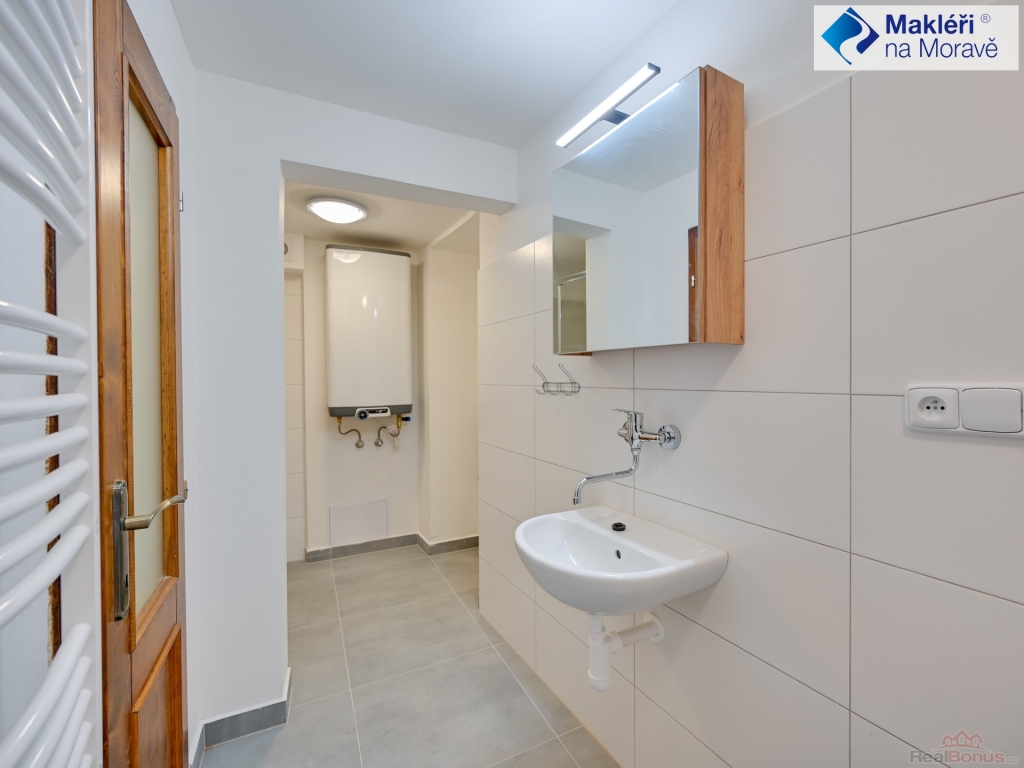 Všechny tyto byty se nacházejí v 1. NP rodinného domu v centru obce, a já vám nyní představím byt 2+kk, který se možná stane vaším domovem. Tento byt má samostatný vstup z ulice, celková výměra činí 73,7 m2, více info najdete v příloženém půdorysu. Byt tvoří vstupní chodba s menší vestavnou skříní, obývák spojený s kuchyňským koutem, ve kterém je kuch. linka na zakázku se spotřebiči (indukční varná deska, el. trouba, digestoř, myčka), dále je zde stůl se židlemi, v technické místnosti vestavná skříň, ostatní nábytek a vybavení si nájemce přinese vlastní. Koupelna je se sprchovým koutem, samostatným WC , umyvadlem a místem s přípojkou pro pračku. Topení zajišťuje vlastní elektrokotel napojený na radiátory, umístěný v technické místnosti, ohřev vody elektrický bojler. Je zde dvojí tarif. Byt má vlastní elektroměr i vodoměr, přípojku k internetu přes optický kabel CETIN. Okna jsou plastová s dvojskly. V bytě je pouze to, co vidíte na fotkách, ostatní vybavení si nájemce přinese vlastní. Parkování je možné u domu nebo na protějším parkovišti. Kola si můžete dávat do přístřešku v uzamčeném doře za domem.