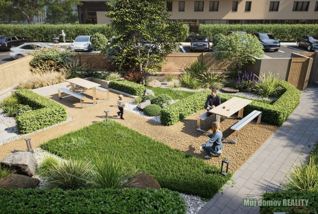* klidný vnitřní dvůr se zelení a posezením