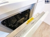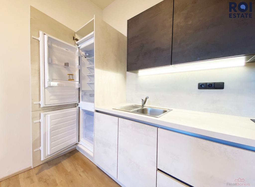Byt je vybaven kuchyní na zakázku, včetně lednice, myčky nádobí, trouby, varné desky a digestoře. Povšimněte si vinylových podlah v dekoru dřeva.