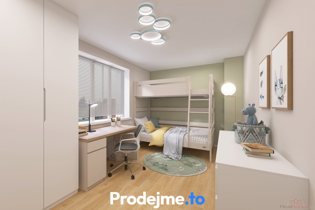 Jednotka v patře: Sestává z obývacího pokoje s kuchyňským koutem, ložnice a samostatné toalety, kterou lze snadno rozšířit o sprchový kout. Tyto prostory navíc přímo sousedí s půdou, což otevírá cestu k dalšímu rozšíření o nové obytné místnosti.