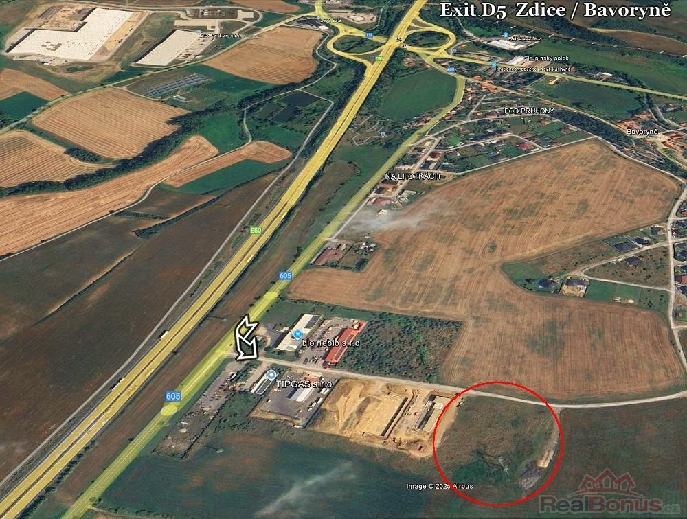 Rovinný pozemek se nachází v Průmyslové nově vzniklé zóně Bavoryně, v blízkosti Editu dálnice D5. Pozemek je z části omezen VN a ochranným pásmem. Byla vypracována a schválena studie zastavitelnosti a to stavbou cca 2000 m2, a zpevněnými plochami cca 2000 m2. Komunikace pro příjezd buduje obec Bavoryně. Přípojky projednány a odsouhlaseny, Lze zaslat plné znění UR, jež popisuje napojení areálu a jejich specifikace. Průmyslová hala vhodná pro sklad či výrobu. Administrativní zázemí - viz foto.