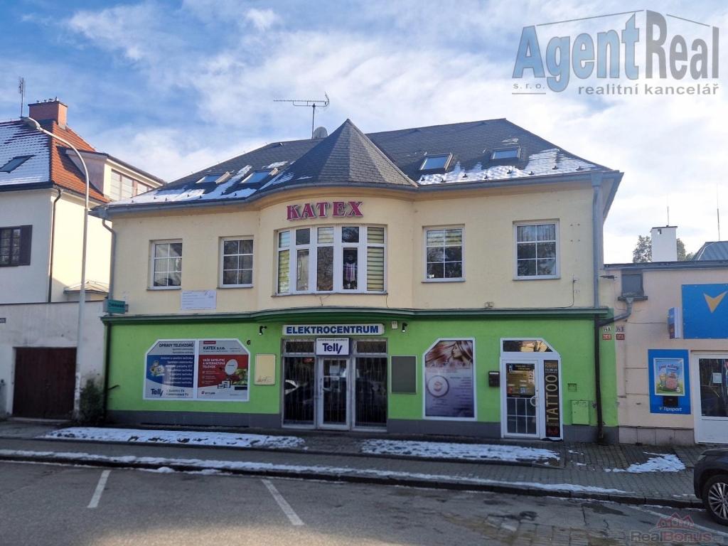 Nabízíme prodej komerčního areálu v centru Šumperka. Jedná se o bývalou prodejnu a servis firmy KATEX. Hlavní budova byla přestavěna do dnešní podoby v roce 2000. V přízemí se nachází hlavní prodejní prostor, který lze rozšířit místo stávající kanceláře a skladu na 92.2 m2. Na hlavní prostor navazuje otevřená místnost 38.7 m2 a lze získat celkovou prodejní plochu cca 131 m2. V zadní části jsou dva sklady, menší kancelář a kout s malou kuchyňskou linkou (celkem 85 m2) a zcela novým plynovým kotlem, který zajišťuje vytápění pro všechny komerční prostory .