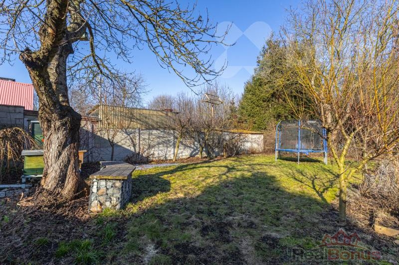 Zahrada je osázena ovocnými stromy a nabízí příjemné soukromí i prostor pro relaxaci, rodinné posezení nebo zahradničení.