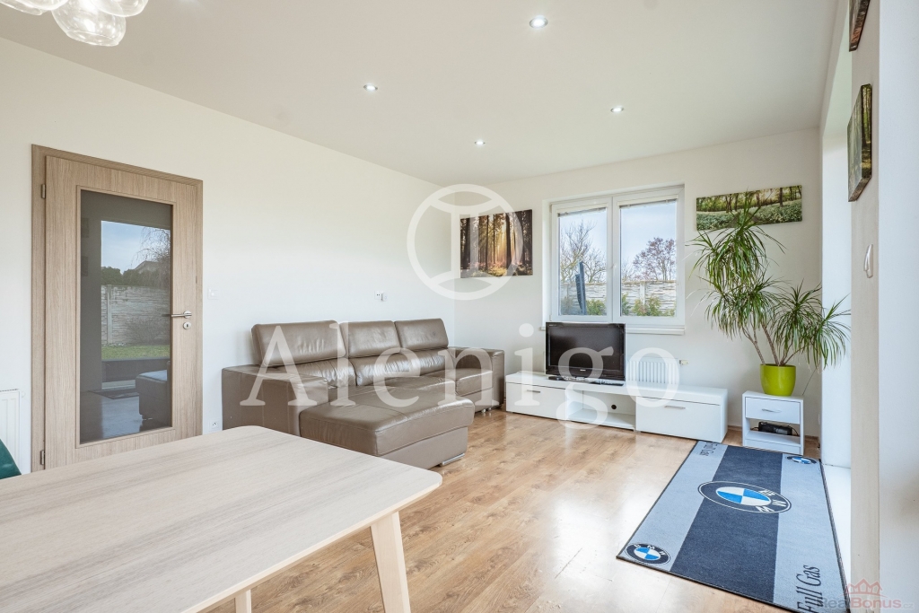 V přízemí se nachází obytná část domu, jeho hygienické zázemí a technické zázemí. Hlavní vstup do objektu ústí do chodby. Chodba tvoří hlavní komunikační uzel objektu. Jsou z ní přístupné všechny místnosti v přízemí. Obývací pokoj a kuchyň jsou vzájemně propojeny. Z obývacího pokoje je možné vstoupit přímo do zahrady . Přízemí je dispozičně rozděleno na chodbu, koupelnu , WC, 3x pokoj, kuchyňský kout a obývací pokoj. Všechny obytné místnosti jsou přímo odvětrány a osvětleny pomocí oken. Dům je vytápěn pomocí závěsného plynového kotle v provedení Turbo umístěného ve výklenku na chodbě.