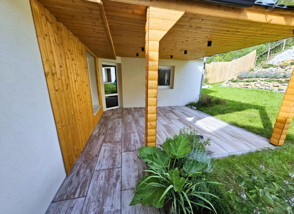 Dům zahrnuje: vstupní halu, tři ložnice, prostorný obývací pokoj s kuchyňským koutem a přímým vstupem na zastřešenou terasu, koupelnu s WC,