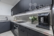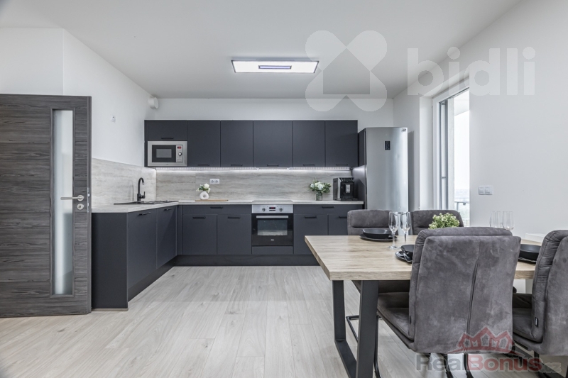 Dispozice bytu je velmi praktická a nabízí vysoký komfort pro každodenní život. Dominantou bytu je prostorný obývací pokoj s kuchyňským koutem, který je vybaven moderní kuchyňskou linkou včetně vestavěných spotřebičů. Celý prostor je vzdušný a díky velkoformátovým oknům a jihozápadní orientaci velmi světlý po celý den. Předokenní žaluzie pak zajistí dostatečnou ochranu před horkým letním sluncem a dodají i maximální míru soukromí.