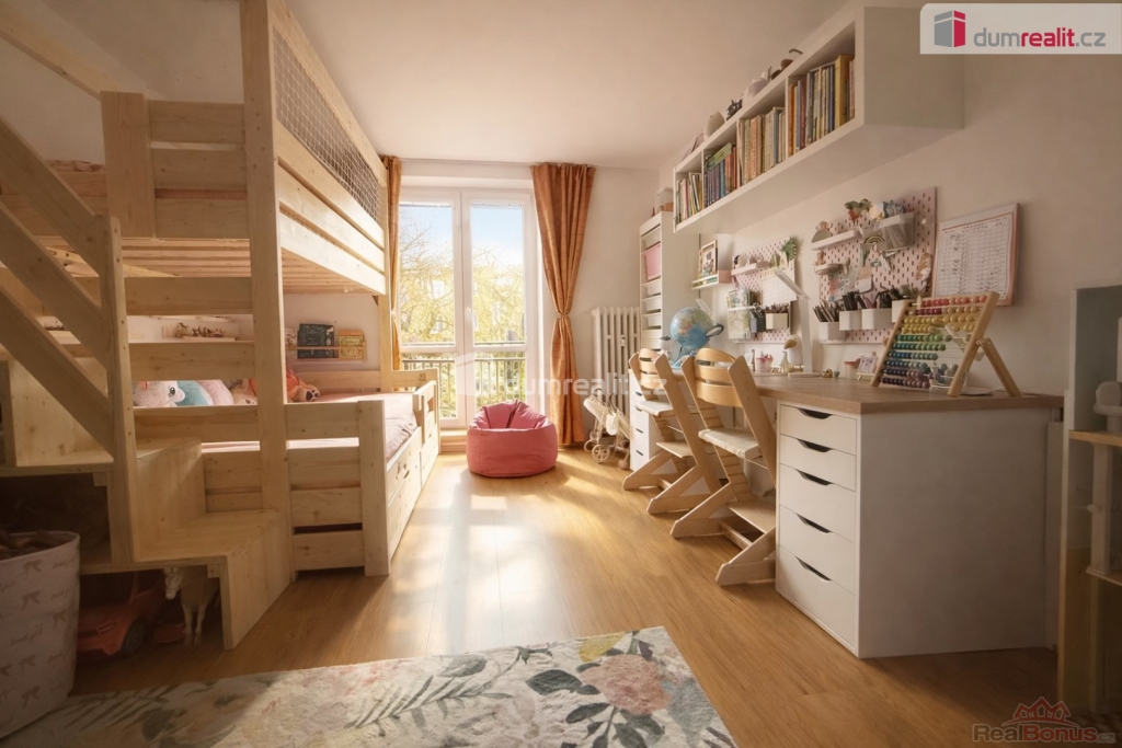 Z obývací části se vstupuje do dvou samostatných, velmi prostorných pokojů po stranách, které mohou sloužit jako ložnice, dětský pokoj či pracovna. Dispozice bytu tak nabízí příjemné soukromí pro rodinu i pár, který chce mít oddělené místnosti.