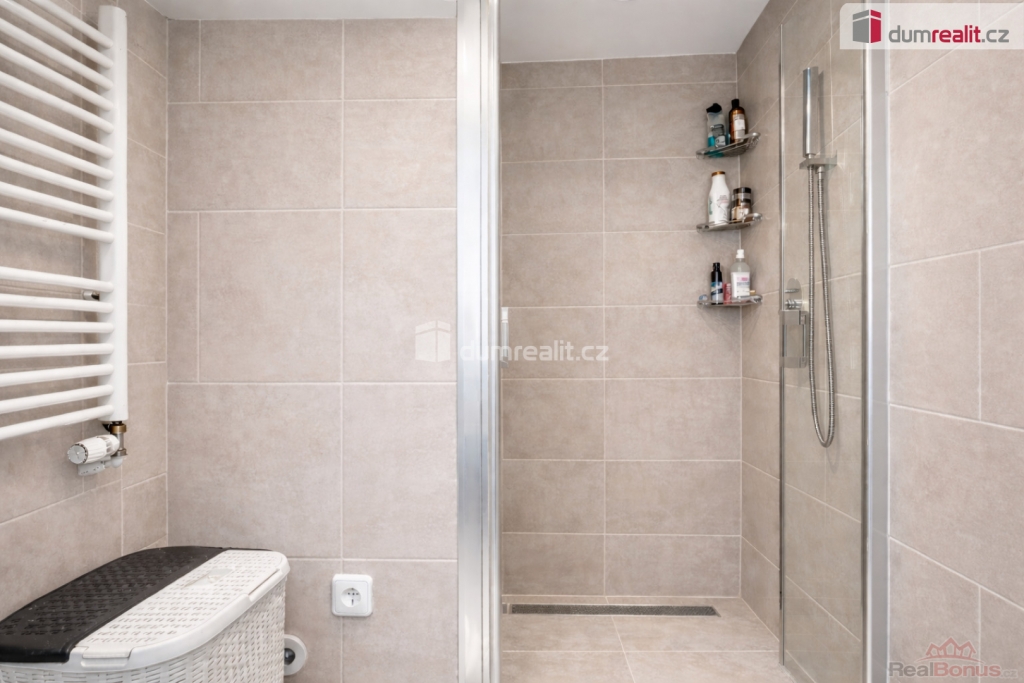 Koupelna je rovněž nově zrekonstruovaná a vybavená prostorným sprchovým koutem, toaletou a moderním sanitárním vybavením, které zajišťuje pohodlí při každodenním užívání.