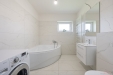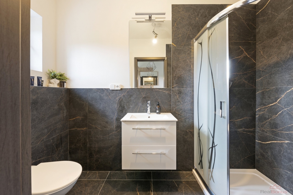 Prostorný a světlý obývací pokoj propojený s kuchyňským koutem, který je kompletně vybaven: indukční varná deska, el. trouba, digestoř, lednice, mrazák a myčka. Z obývacího pokoje je přímý vstup na terasu a do zahrady, což vytváří ideální prostor pro rodinné posezení a relaxaci. Tři prostorné ložnice poskytují dostatek soukromí pro celou rodinu. K dispozici je praktická komora pro uložení věcí. Dvě moderní koupelny ? jedna se sprchovým koutem a WC, druhá s vanou a WC.