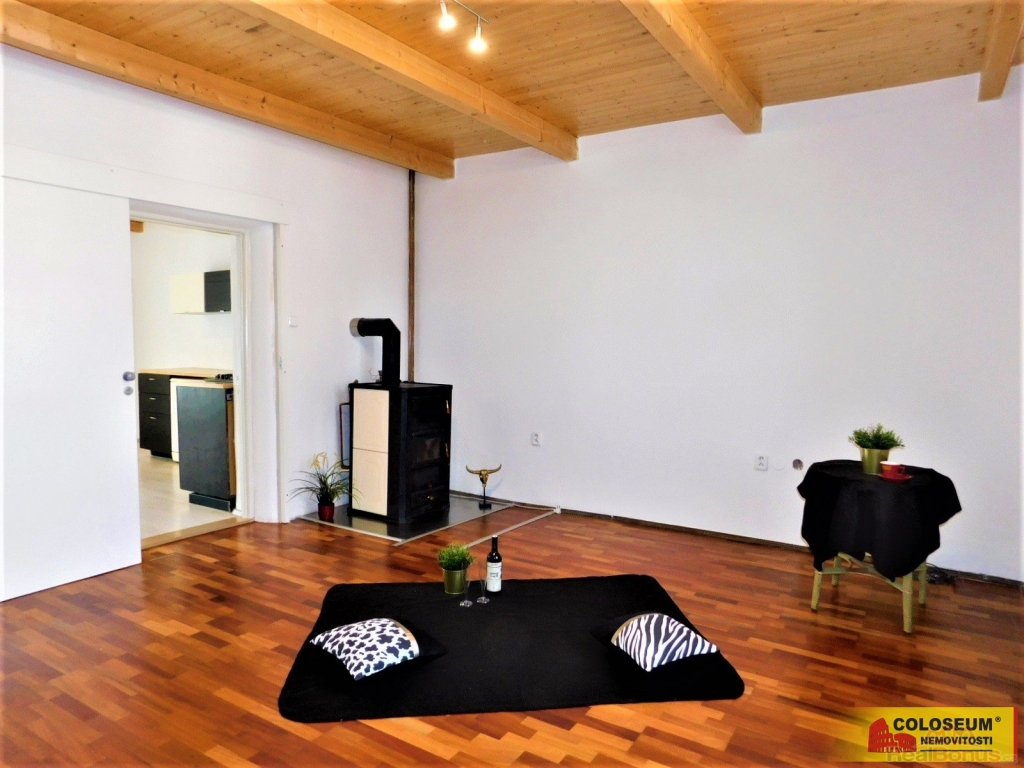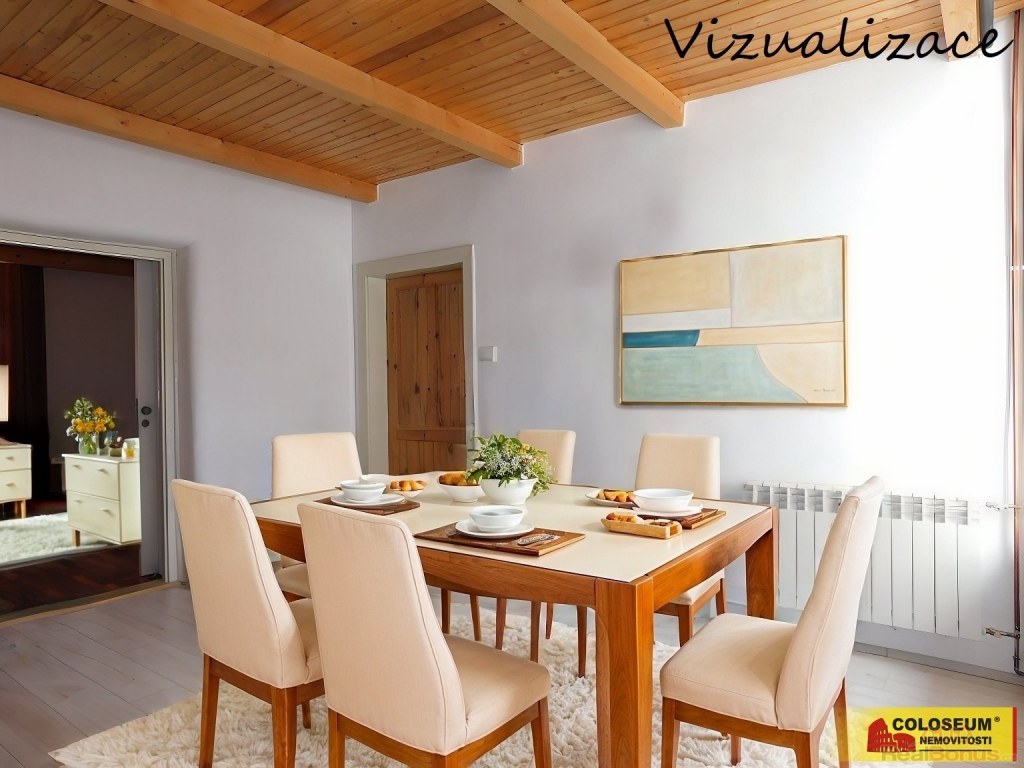 Toaleta je samostatná. Další velkou výhodou tohoto domu je, že má komoru a je podsklepený. Pro lepší představu o možném budoucím stavu jsme přiložili vizualizace interiéru a venkovního posezení. Vytápění domu je řešeno plynovým kotlem nebo krbovými kamny s výměníkem. Ohřev vody zajišťuje plynový kotel.