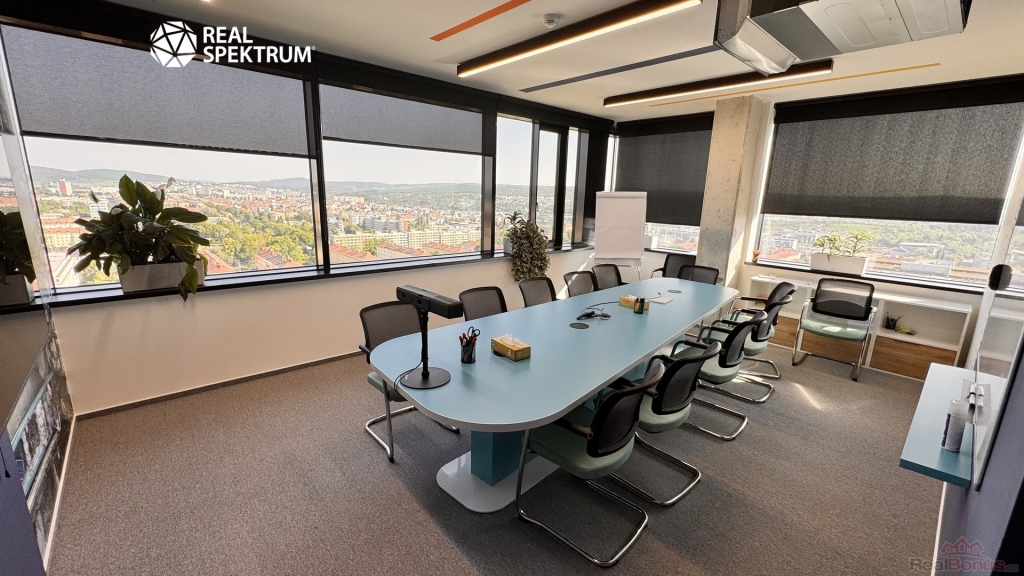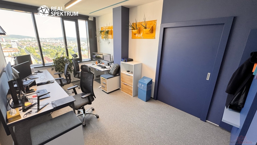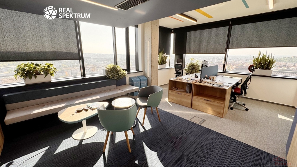 Výhled? Super. Přístup? 24/7. Vybavení? Kompletní ? zdvojené podlahy, zátěžové koberce, otevíratelná okna, žaluzie, vysokorychlostní internet, tepelná čerpadla. Recepce, výtahy, ostraha, parkování? Samozřejmost.