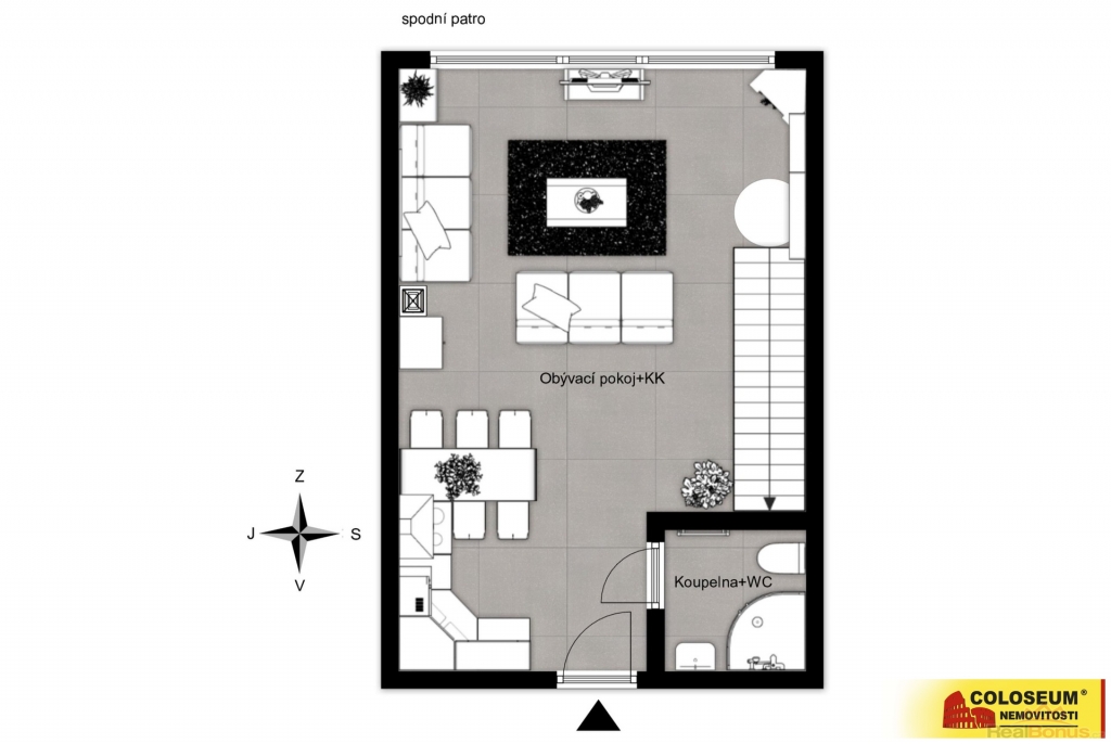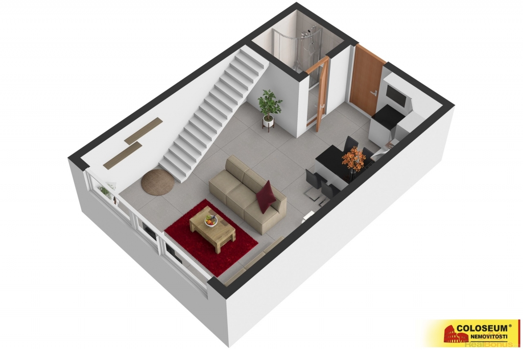 Moderní mezonetové apartmá bylo praktickou dispoziční změnou zvětšeno z 42 m2 na 47 m2. Apartmán tak má otevřenější prostor a styl. Bylo dosaženo velkorysejšího pojetí bližšího dispozici 2+kk, kdy je kuchyně součástí obytné části.