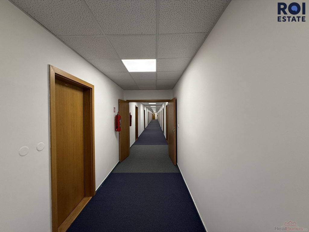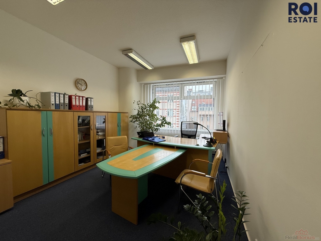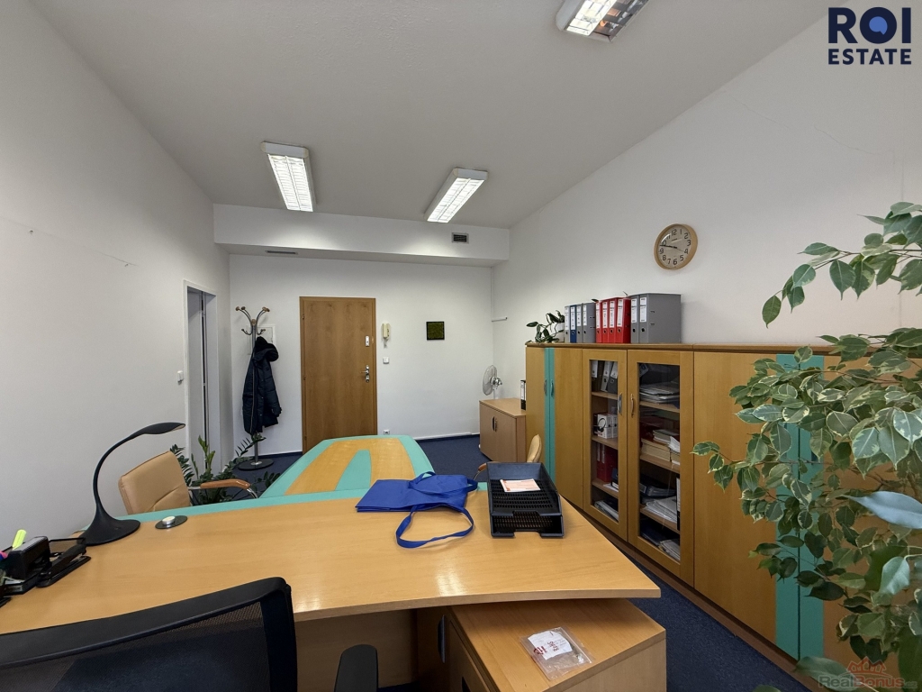 Prostor tvoří dvě samostatné místnosti, které lze využít jako oddělené kanceláře, případně jako pracovní část a jednací místnost. Díky velkým oknům je interiér příjemně prosvětlený, podlahu pokrývají zátěžové koberce, které zajišťují komfort i dobrou akustiku.