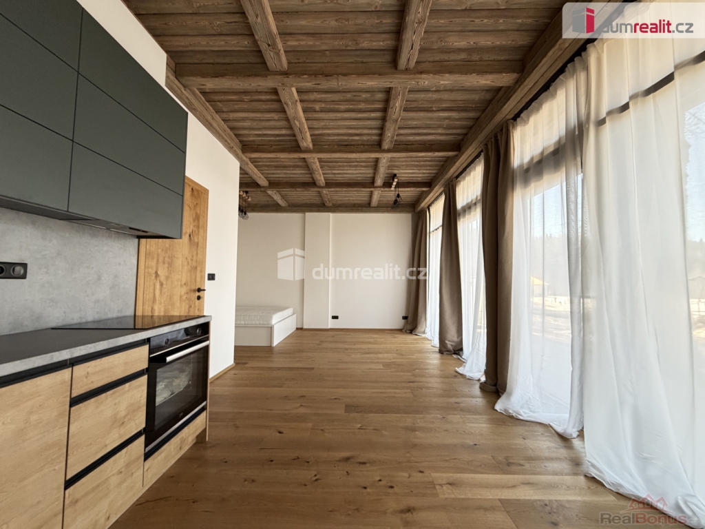 Včetně kuchyňské linky, parkovacího stání a sklepní kóje., prodej atraktivního apartmánu o dispozici 1+kk a podlahové ploše 38 m s terasou o výměře 5 m, situovaný v přízemí novostavby prestižního apartmánového projektu Corso Harrachov, přímo v centru vyhledávaného horského střediska Harrachov.
