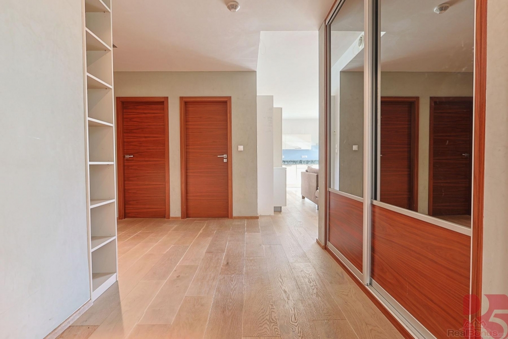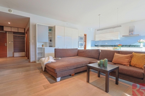 Dominantou bytu je prostorný obývací pokoj (přes 40m2) s přímým vstupem na velkou dřevěnou terasu z exotického dřeva (massaranduba), v létě zastíněná hliníkovou bioklimatickou pergolou. Na terasu je vstup i z ložnice a dětského pokoje. Okna bytu na jihovýchod.