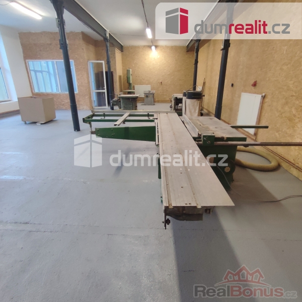 , Dumrealit.cz Vám zprostředkuje pronájem prostor o výměře 200 m, které doposud sloužily jako truhlářská dílna na výrobu nábytku a dalších komponentů. Tyto prostory mají dva přístupy. První část tvoří najížděcí rampa, sloužící k nakládce a vykládce materiálu a hotového zboží. V druhém případě lze do objektu vstoupit vedlejšími schody a uzamykatelnými dveřmi, které vedou na zadní chodbu. Ta propojuje dvě části celého komplexu. Chodby je možno využít k uskladnění materiálu. Samostatné vnitřní prostory slouží k výrobě. Dílna je vybavena stroji ke zpracování a obrábění dřeva - jedná se o pásovou brusku, formátovací pilu s prořezem, protahovačku s hoblovkou, dále odsávání, frézu, pásovou pilu, vertikální a horizontální vrtačku. Toto vše je součástí nájmu.