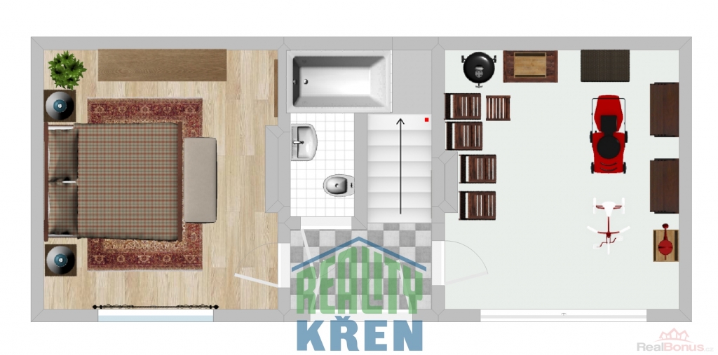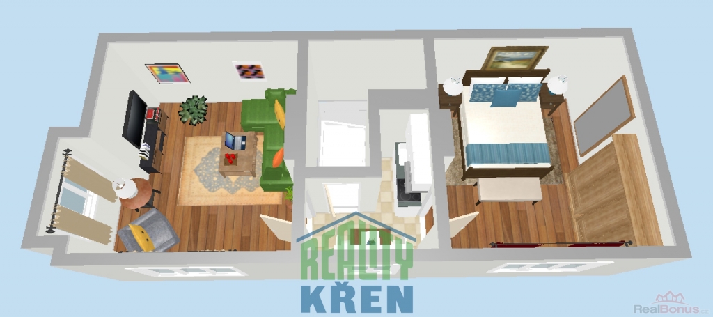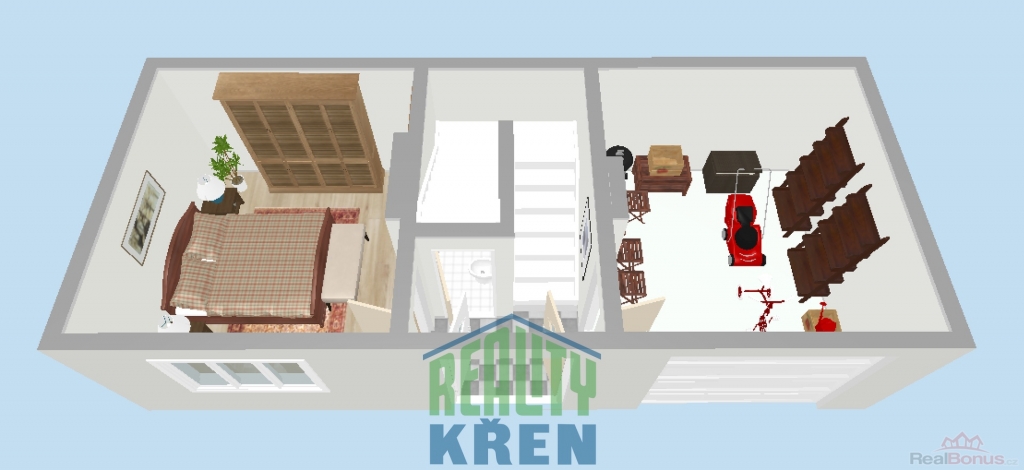 2. NP (43 m2): 2x pokoj, malá kuchyň;