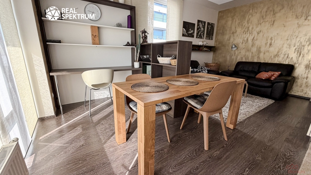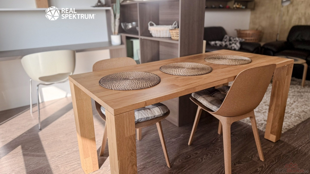 Obývací část s kuchyňským koutem tvoří přirozené centrum bytu. Moderní kuchyňská linka s vestavěnými spotřebiči navazuje na jídelní prostor i útulnou obývací zónu. Interiér je zařízen vkusně a nadčasově, s důrazem na jednoduchost a pohodlí. Praktickým bonusem je také pracovní kout vhodný pro práci z domova.