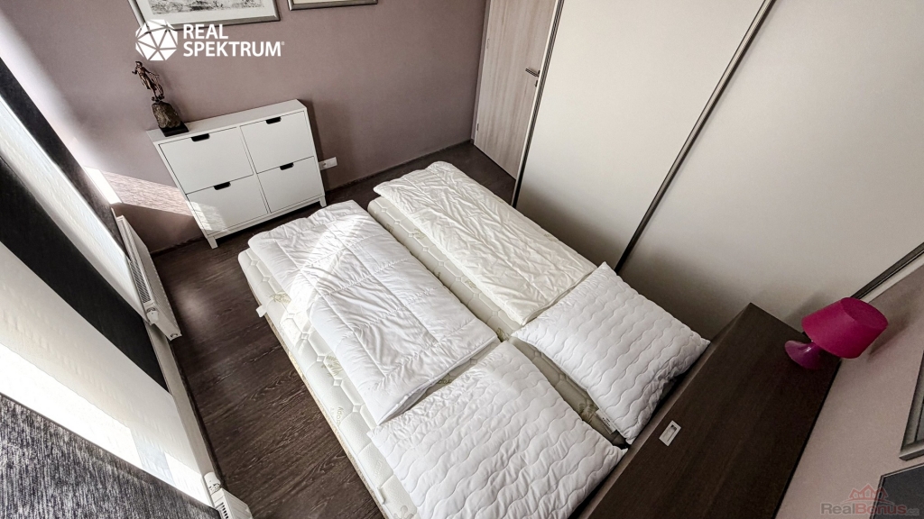 Samostatná ložnice poskytuje klidné zázemí a dostatek úložného prostoru. Balkon navazující na obytný prostor je ideálním místem pro ranní kávu nebo večerní odpočinek.