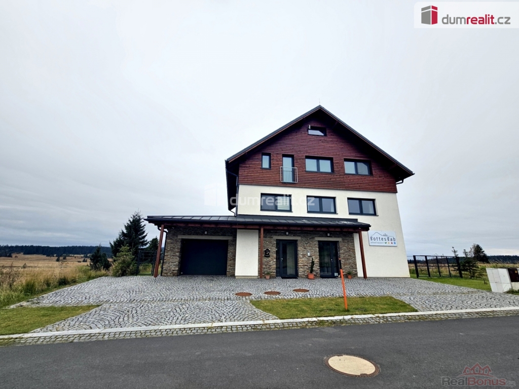 3 samostatné apartmány (2x2, 1x4-5), lyžárna, kolá, Dumrealit.cz Vám zprostředkuje exklusivní prodej novostavby RD s penzionem v obci Boží Dar. Vlastní vstup k bytu. Byt o velikosti 3kk, dvě koupelny, garáž, terasa zahrada, předsíň. Vlastní vstup do penzionu. 4 samostatné apartmány velikosti 2+kk, lyžárna nebo kolárna, sklad. Penzion v přízemí místnost pro jidelnu, kolárna či lyžárna dle období, technická místnost s TČ, pračkama, skladem. 1. patro apartmán 2kk se 2-4 lůžky, kuchyně, koupelna s WC a sprchou. 2.patro 1x apartmán apartmán 2+kk s 2lůžkem, kuchyní, koupelnou s WC a sprchou a 2x apartmán se 4 lůžky, kuchyní, koupelnou s WC a sprchou. Dům kopletně zabezpečen kamerovým systémem a zabezpečovacím zařízením. Možnost celoročního využití. Veškeré informace a prohlídky u RK. Ev. číslo: 654856. Energetický štítek: C