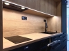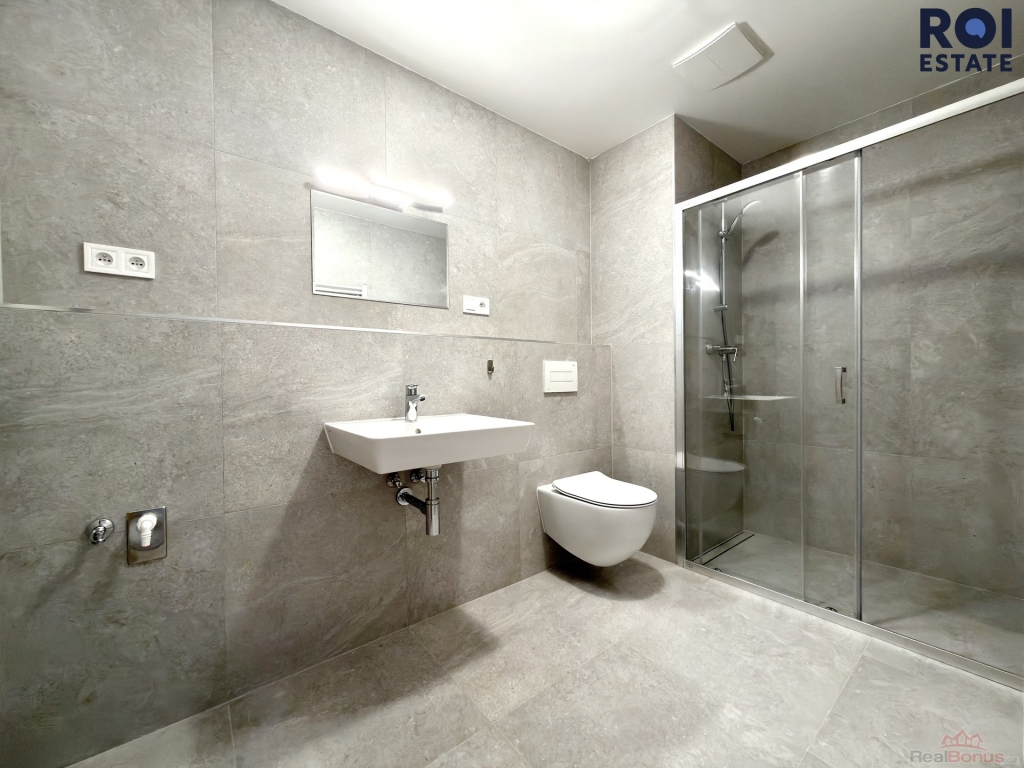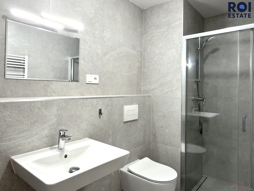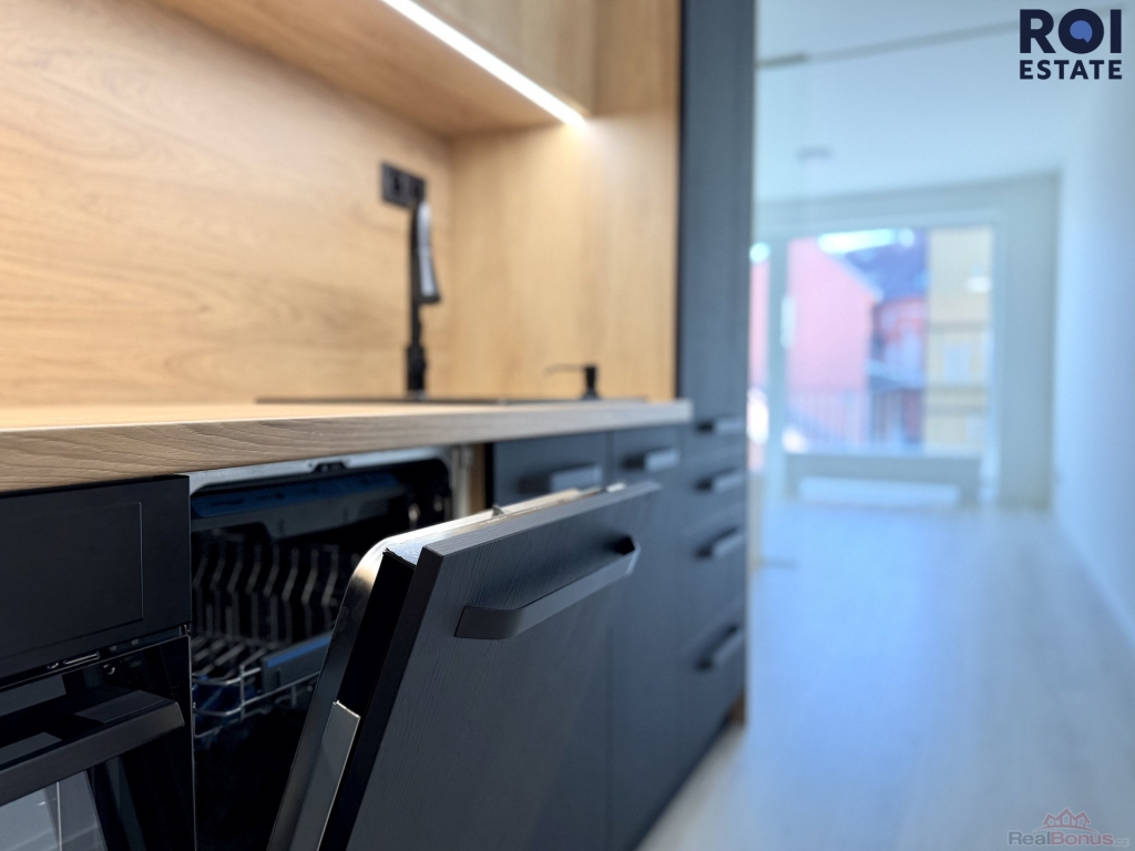 Interiér je moderní a vzdušný. Obytný prostor je chytře rozdělen elegantní skleněnou stěnou, která dodává bytu styl a zároveň zachovává dostatek světla. Kuchyňská linka je vyrobena na míru, je plně vybavena vestavěnými spotřebiči značky Electrolux ( trouba, indukční varná deska, digestoř, myčka), takže se můžete ihned.