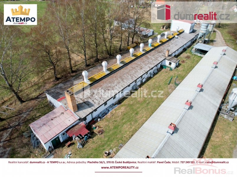 Cena je včetně provize RK a právního servisu. Více informací naleznete na www.atemporeality.cz, Dumrealit.cz Vám zprostředkuje prodej zemědělského objektu v obci Majdalena, Třeboňsko. Budovy sloužili pro chov prasat se zázemím a stojí na pozemku o celkové výměře 18.720 m se zastavěnou plochou 2.181 m. Pozemek s objekty leží na strategickém místě ve velmi žádané rekreační lokalitě CHKO Třeboňsko. Celou nemovitost lze využít pro podnikatelský záměr s přípravou výstavby domů k trvalému bydlení dle požadavků CHKO a obce. Po jednání s příslušnými úřady máme tuto variantu připravenu pro další zpracování. Druhou možností podnikatelského záměru je pokračování v zemědělské činnosti. Provozy živočišné výroby jsou technologicky rozděleny na automat řízený PC pro výkrmu a poloautomat pro porodnu a březárnu. V současné době jsou dle územního plánu plochy vedeny jako zastavitelné, s funkčním využitím pro výrobu a skladování zemědělské. Doporučuji osobní prohlídku. Více informací Vám poskytne realitní makléř Pavel Čada z RK A TEMPO s.r.o. fungující pod ochranou známkou dumrealit.cz. Těšíme se na prohlídce. Ev. číslo: 641080. Energetický štítek: G