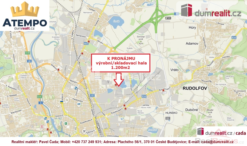 Více informací Vám poskytne realitní zprostředkovatel Pavel Čada., Dumrealit.cz Vám zprostředkuje pronájem výrobních/skladovacích prostor o celkové výměře 1.200m s bezbariérovým přístupem, možností vykládek a nakládek kamionových souprav v ulici u U Sirkárny, České Budějovice. Prostory se nachází na strategickém místě ve vzdálenosti 3km od sjezdu z dálnice D3. Jedná se o netemperovaný, výrobní nebo skladovací prostor. Součástí pronájmu je veškeré vybavení regálovými systémy a případné další úpravy pronajímaného prostoru jsou možné po dohodě s majitelem areálu. Dále máme již v ceně pronájmu i 4 parkovací místa pro osobní automobily. Energie jsou fakturovány dle skutečné spotřeby. NELZE skladovat hořlaviny a chemické látky. V místě pronájmu lze zřídit sídlo firmy. Ideální místo připravené pro centralizované rozšíření působení a budování svého jména. Více informací Vám poskytne realitní makléř Pavel Čada. Ev. číslo: 643352. Energetický štítek: G