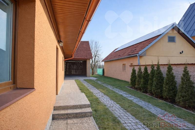 K domu dále náleží rekonstruovaný přístavek o velikosti cca 90 m2, který lze využít jako garáž, pergolu, dílnu nebo skladovací prostor. Nájezdy k případné garáži jsou provedeny z žulových kostek, což zajišťuje vysokou odolnost i estetický vzhled.