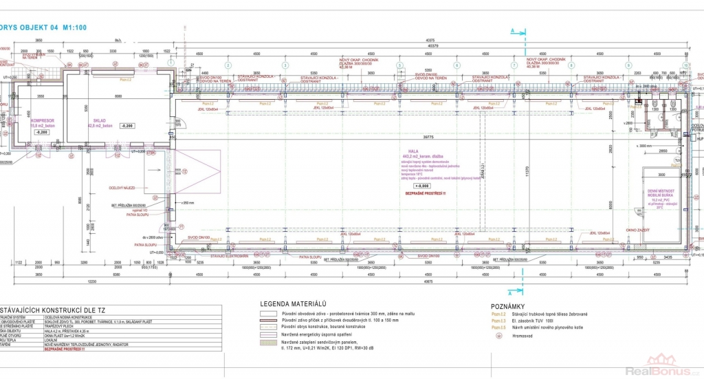 hala 443 m2; sklad 42,8 m2; sklad 15,8 m2; soc. zázemí 6,5 m2