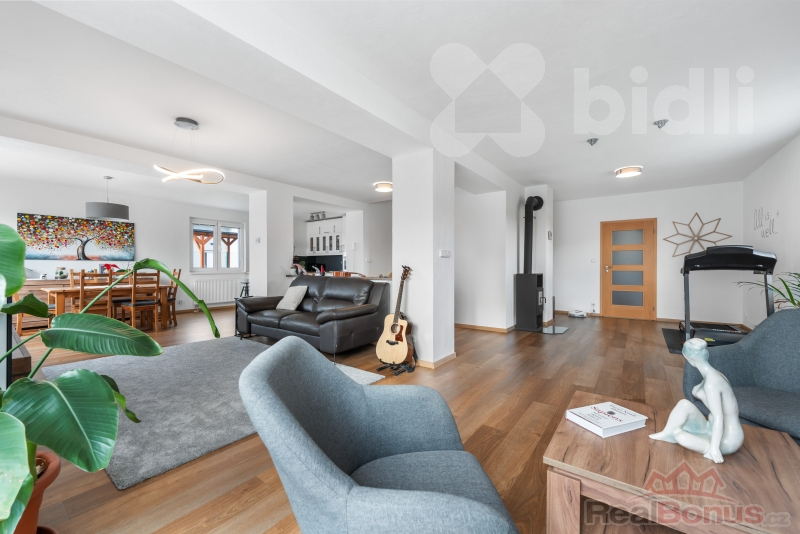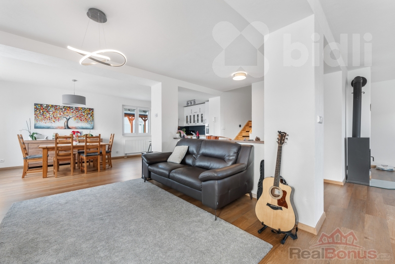 - vzdušný otevřený prostor obývacího pokoje s kuchyní a jídelnou (72 m2)