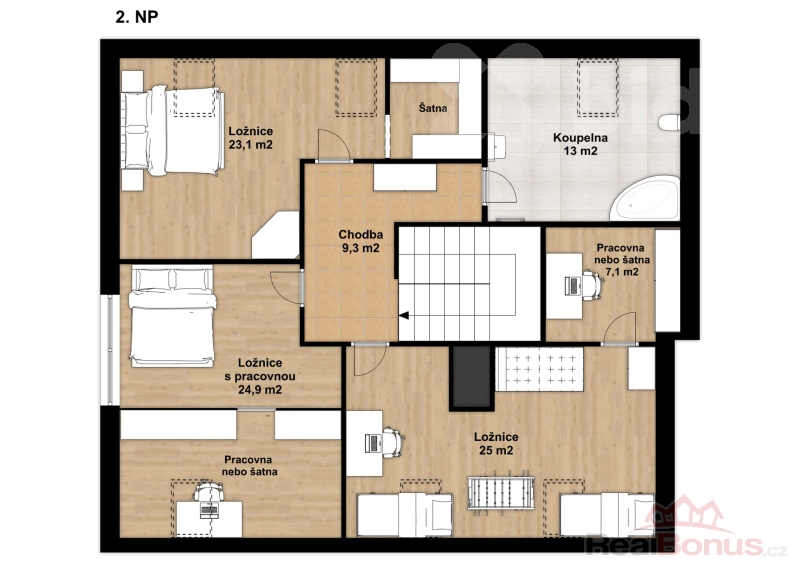 - 3 ložnice (23 m2, 25 m2 a 32 m2) - každá se šatnou / menším navazujícím pokojem