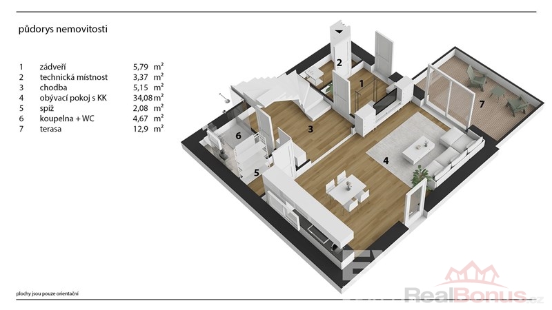 V přízemí se nachází zádveří a technická místnost s tepelkem, přípojkami pro pračku a sušičku, vyvedená kabeláž pro připojení fotovoltaiky a také praktická výlevka.