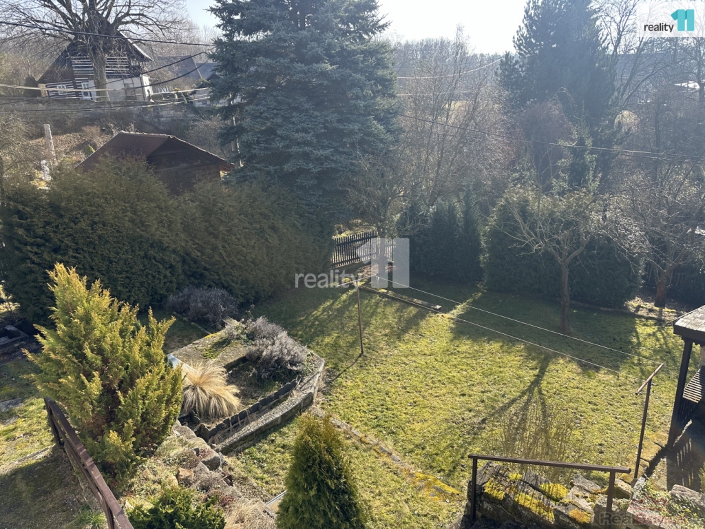Zahrada je svažitá, jsou zde ovocné stromy a Ořešák (vlašské ořechy).