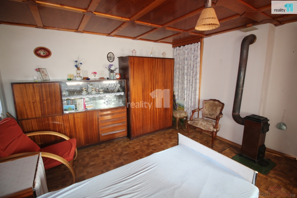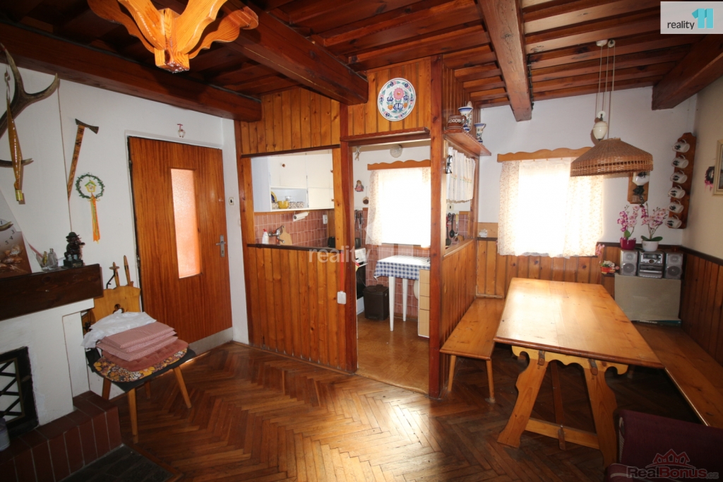 Střecha: eternit, dřevěné obložení domu dodává rustikální charakter.