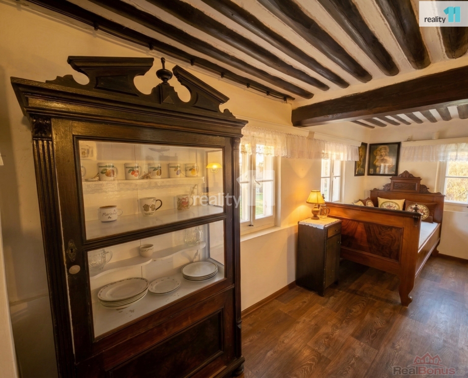 Dům se pyšní zachovaným původním rázem dřevěné trámové stropy, palubkové obložení a historický nábytek tvoří nefalšovanou venkovskou atmosféru.