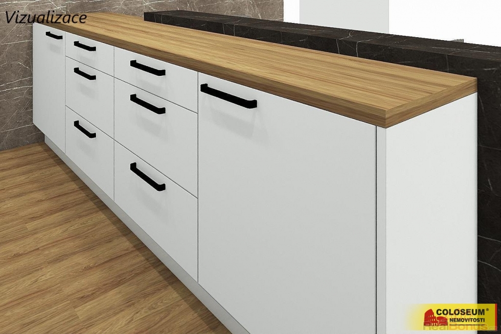 Velkou výhodou je, že v ceně domu je zahrnuta kuchyňská linka s možností výběru barvy, přičemž budoucí majitelé mají také možnost výběru podlah, dlažby i obkladů dle vlastních preferencí. V inzerci jsou použity vizualizace, které slouží pro lepší představu o možném budoucím designu kuchyně a obytného prostoru.