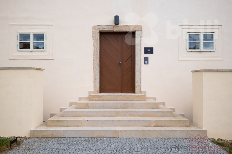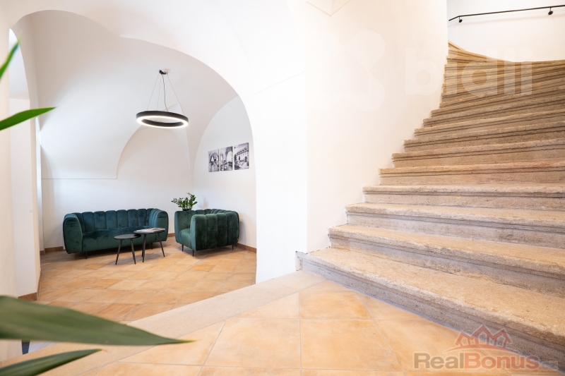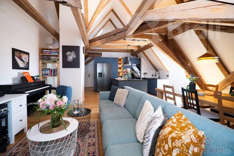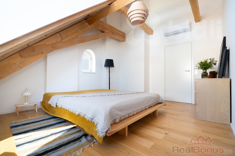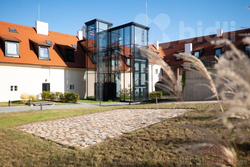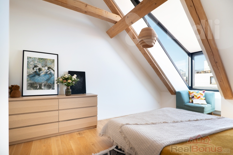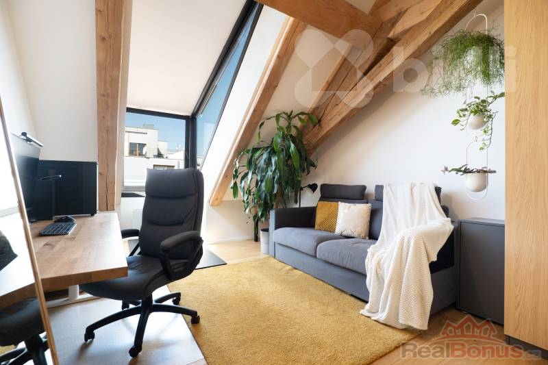 Atypický byt o rozloze 123,5 m2 v nejvyšším podlaží zaujme reprezentativní dispozicí 3+kk a nadstandardním provedením interiéru. Kuchyňská linka s deskou z přírodní žuly Nero Assoluto, americká lednice Samsung s výrobníkem ledu, vestavné spotřebiče (kompaktní a parní trouba, indukční deska) Samsung a myčka Electrolux vytvářejí harmonii elegance a funkčnosti. Designová koupelna s volně stojící vanou i prostorným sprchovým koutem podtrhuje atmosféru luxusního bydlení. Komfort umocňují tři klimatizační jednotky Toshiba.