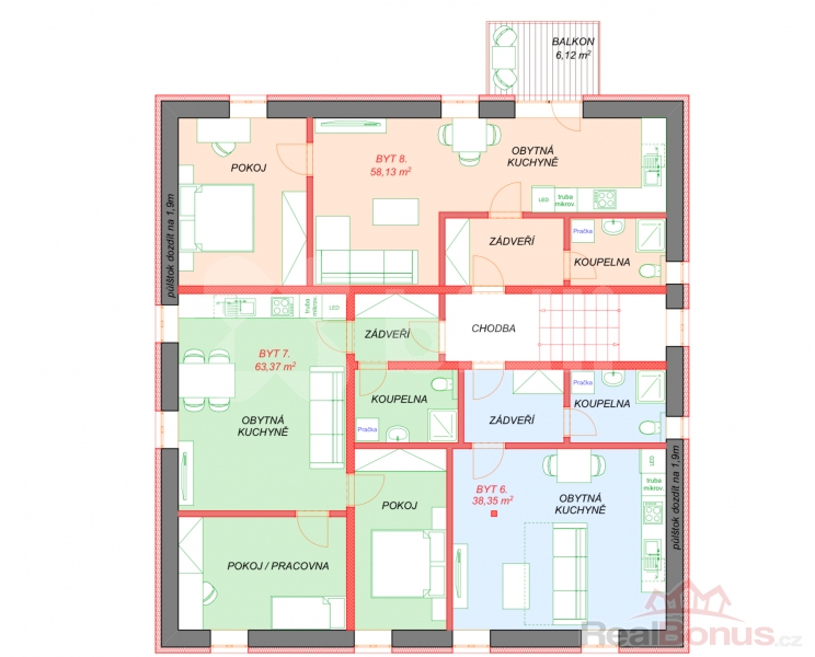 Dům nabízí potenciál přestavby na tři patra a až 8 bytových jednotek. Pro každé patro je již připraven návrh půdorysného rozmístění bytů.