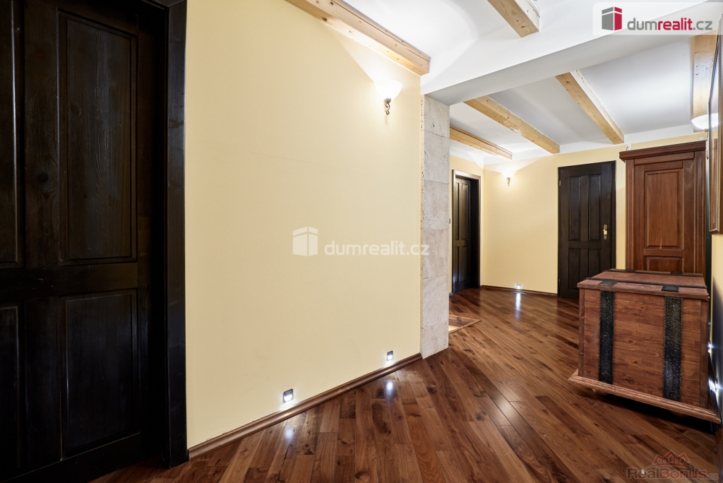 Součástí tohoto pozemku je rodinný dům o dispozici 4+kk. RD je zděný, částečně podsklepený, s podlahovou plochou 230 m. Dispozice domu zahrnuje prostorný obývací pokoj s krbovými kamny, kuchyň s kuchyňskou linkou na míru, jídelnu, 3 ložnice s vlastními koupelnami a WC. V přízemí je finská sauna vč. sprchy a odpočívárny, zimní zahrada s terasou a vstupem na zahradu. Dále je zde prostorná chodba vč. schodiště, zádveří, samostatné WC a technická místnost. Dům má velký půdní prostor (možnost vybudování další obytné místnosti). Vytápění domu a ohřev vody je zajištěn plynovým kotlem. Dům disponuje elektronickým zabezpečovacím systémem, finskou saunou, venkovní vířivkou a dalšími luxusními prvky. Po kompletní rekonstrukci, kdy byl kladen důraz na kvalitu použitých materiálů, provedení ale i vybavení domu, je dům připraven k okamžitému nastěhování bez dalších investic.