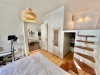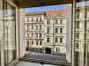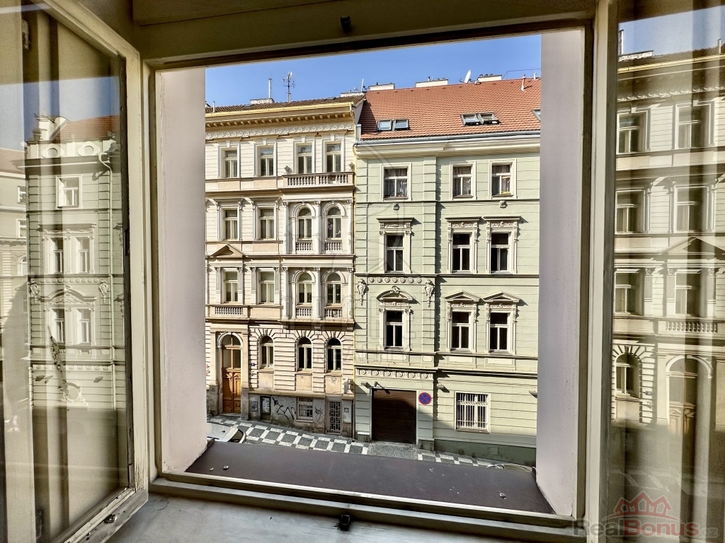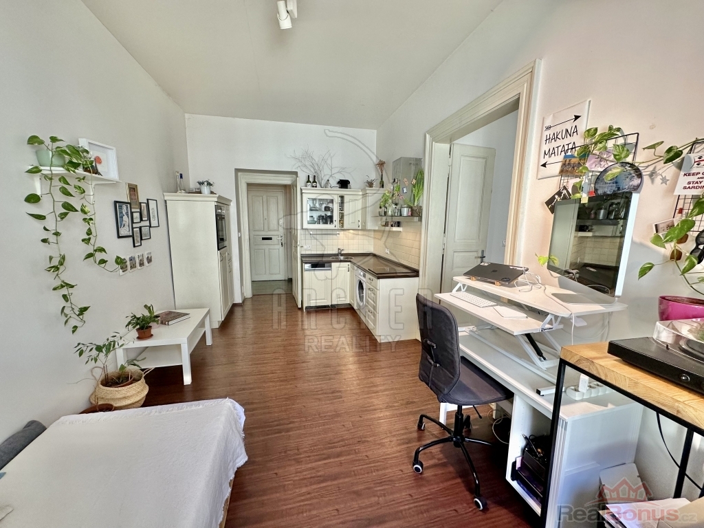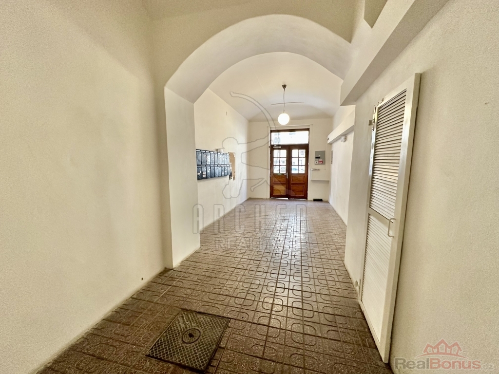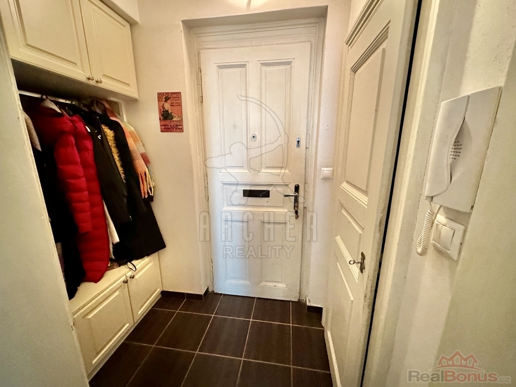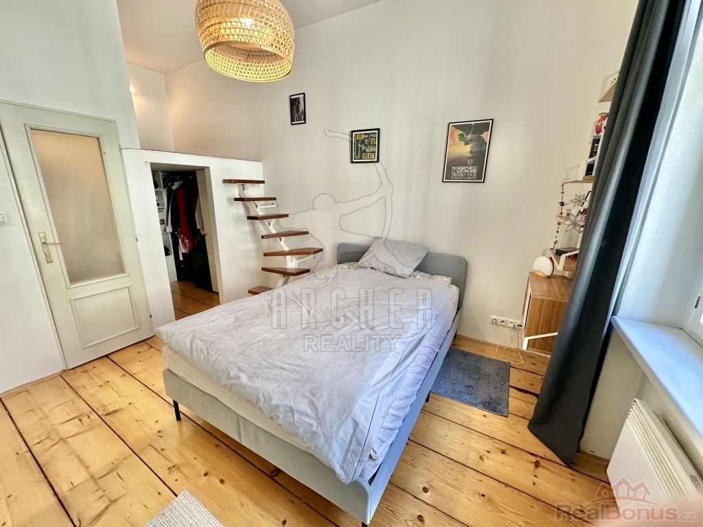 Interiér působí vzdušně díky vysokým stropům a velkým oknům. Velkorysá předsíň s úložnými prostory plynule navazuje na hlavní obytný prostor s kuchyňským koutem. Atmosféru podtrhují dvoukřídlé dveře do ložnice a výhled na zdobné fasády okolních domů. Chytrým využitím výšky místností je vestavěné patro se šatnou, které přidává další úložný i praktický prostor.